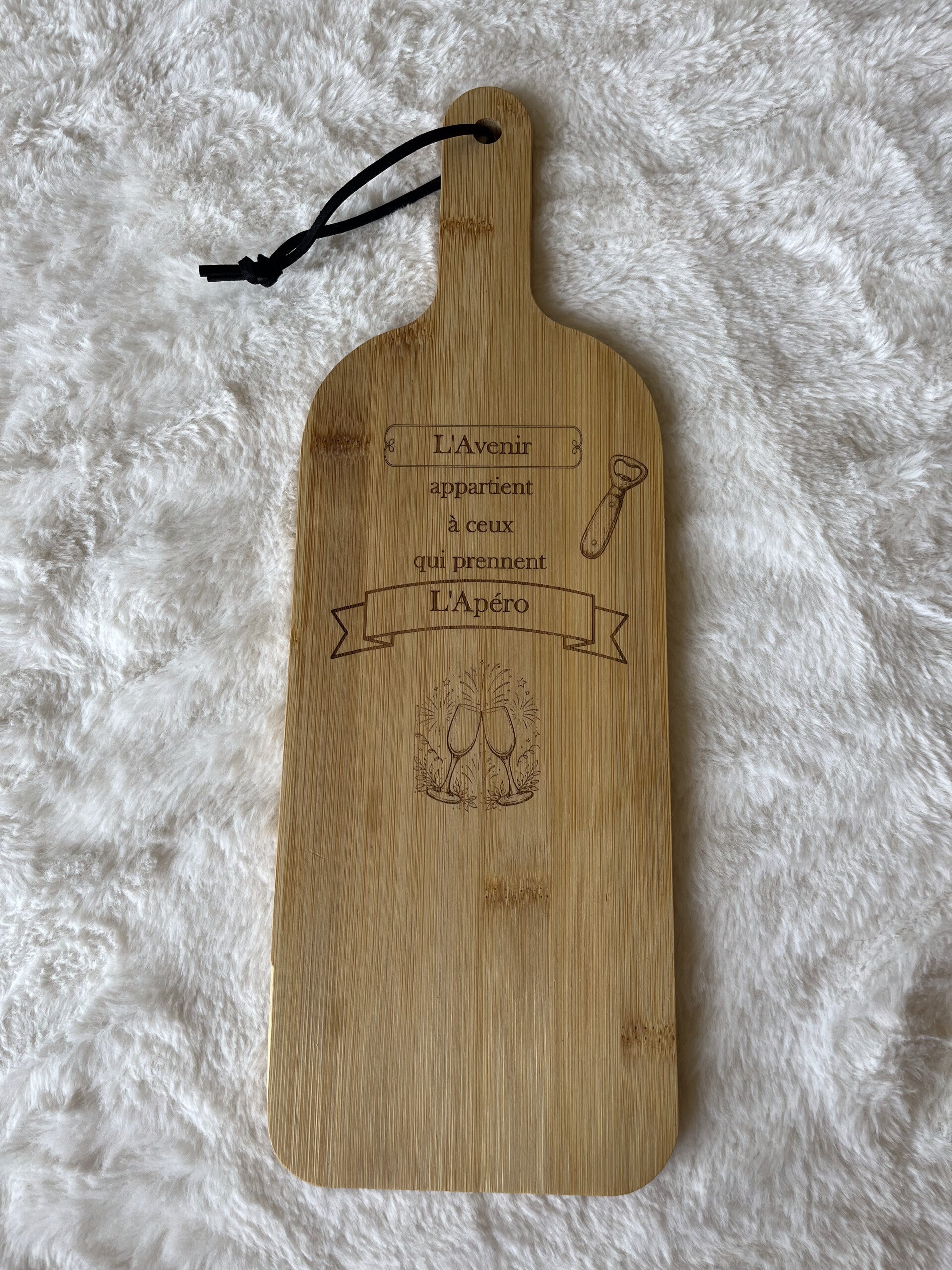 Fabriquée en bambou, elle offre un rendu chaleureux et authentique qui trouve facilement sa place dans toutes les cuisines. Utilisée pour découper, servir l’apéritif ou simplement décorer un plan de travail, elle devient vite un accessoire incontournable. La gravure laser apporte une finition durable, nette et raffinée qui transforme une simple planche en pièce personnalisée à fort impact visuel.