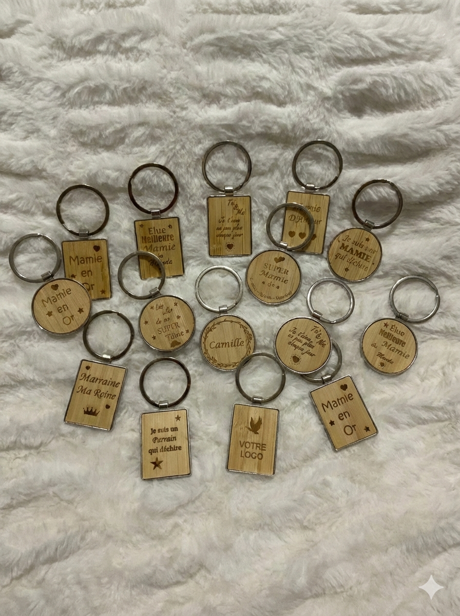 Grâce à sa gravure fine et durable, chaque porte-clé devient un cadeau original et personnalisé, idéal pour remercier une marraine, un parrain, une mamie, un proche, ou encore pour mettre en valeur un prénom, un mot doux ou même un logo. Son format compact en fait un objet du quotidien utile, facile à emporter partout, avec une touche naturelle et chaleureuse grâce au bois.